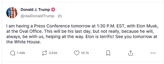 “这将是他的最后一天,但并非完全如此,因为他将始终和我们在一起,一路帮助我们。埃隆太棒了!明天白宫见,”特朗普在Truth Social上写道。