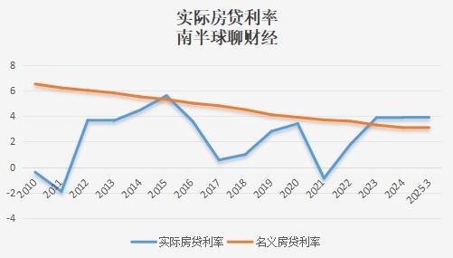 另外,虽然房贷名义利率下行,但减去价格(GDP平减指数)后的实际房贷利率仍在高位——